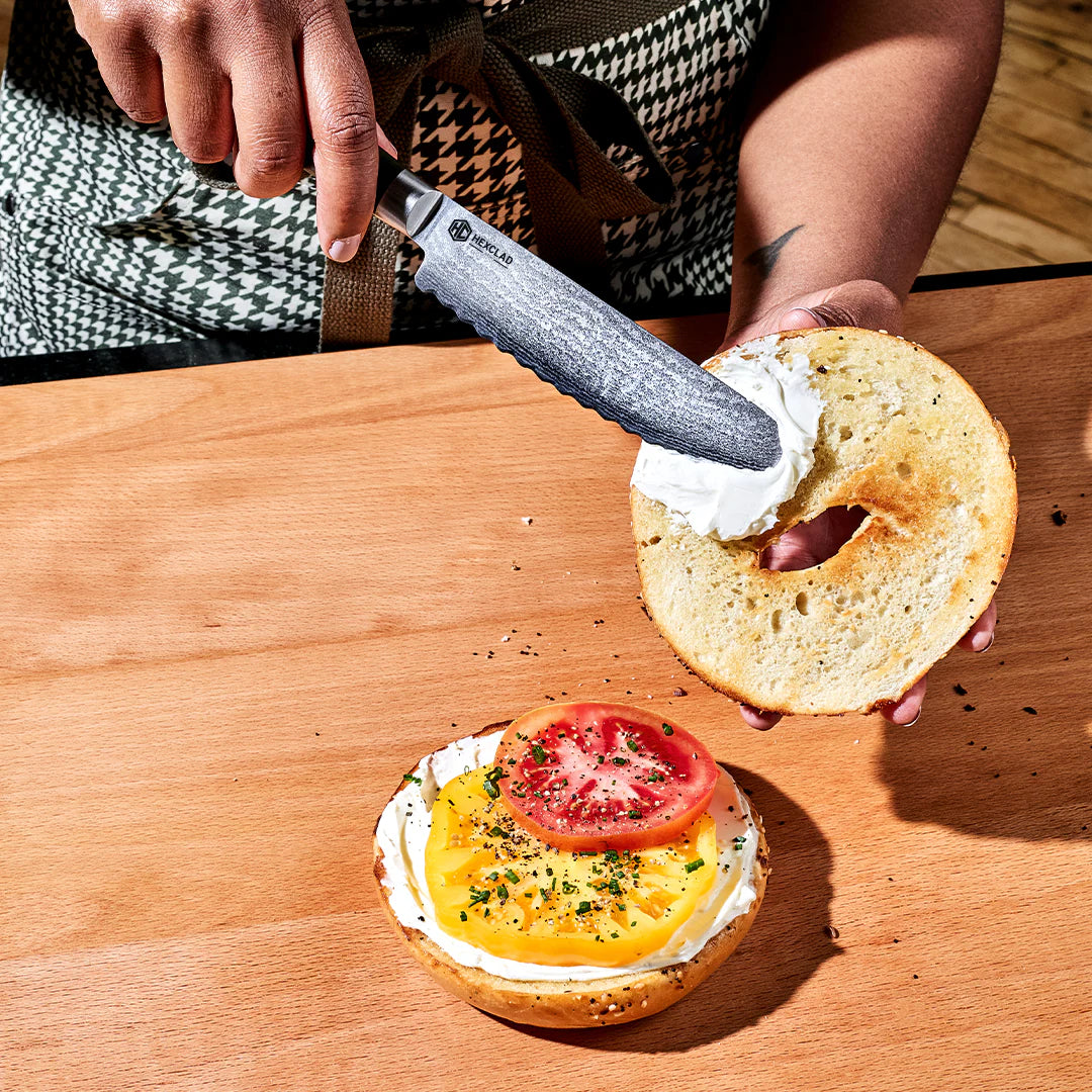 An ideal knife starter set, this dynamic duo comprises two of our most popular knives in smaller, more nimble sizes. There’s a petite, 6-inch chef’s knife ideal for everyday slicing, dicing and mincing, plus a versatile serrated sandwich knife perfect for cutting crusty bread, sandwiches, tomatoes and bagels. (The latter has a round, broad, blade for spreading, too; it’s the knife equivalent of the everything bagel!) Both knives are forged from 67 layers of Japanese Damascus steel for a harder blade–a 60 Rockwell rating–and a sharper edge that stays sharp longer, for effortless slicing.